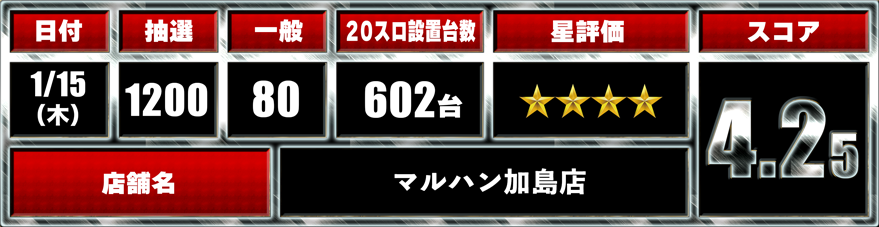マルハン加島店 【取材日】2026.1.15(木) PR 近畿エリア大阪府 グランドマスター取材マルハン加島店 ※記事中のデータはセブンマスター取材班独自の調査によるものでありホールデータを保証するものではございません。 関連店舗 近畿エリア大阪府 マルハン加島店 大阪府大阪市淀川区加島2-7-38 店舗詳細はこちら この記事をシェアする ポストする シェアする LINEで送る URLをコピー 関連記事 近畿エリア大阪府 2026.01.25 【取材日】2026.1.23(金) PR マルハン加島店 グランドマスター取材マルハン加島店 近畿エリア大阪府 2026.01.23 【取材日】2026.1.21(水) PR マルハン加島店 グランドマスター取材マルハン加島店 Daily Week Month 2026.1.25(日) ビッグアップル.加古川店 2026.1.22(木) スロットキコーナ三宮店 2026.1.19(月) マルハン加島店 2026.1.3(土) スロットキコーナ三宮店 2026.1.14(水) マルハン加島店 2026.1.25(日) ビッグアップル.加古川店 2026.1.22(木) スロットキコーナ三宮店 2026.1.3(土) スロットキコーナ三宮店 2026.1.21(水) マルハン加島店 2026.1.23(金) マルハン加島店 2026.1.16(金) マルハン加島店 2026.1.25(日) ビッグアップル.加古川店 2026.1.3(土) スロットキコーナ三宮店 2026.1.15(木) マルハン加島店 2026.1.14(水) マルハン加島店